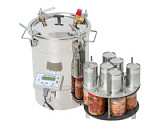 Электрический автоклав из нержавеющей стали с полностью автоматизированным процессом стерилизации. Оснащен электрическим блоком управления (ЭБУ) с возможностью стерилизации в 4 автоматических режимах "Мясо", "Птица", "Рыба", "Компот". В автоклаве предусмотрены автоматические режимы для жестяных банок и реторт-пакетов. Есть возможность сохранения до 10 собственных программ стерилизации для каждого вида упаковки.
